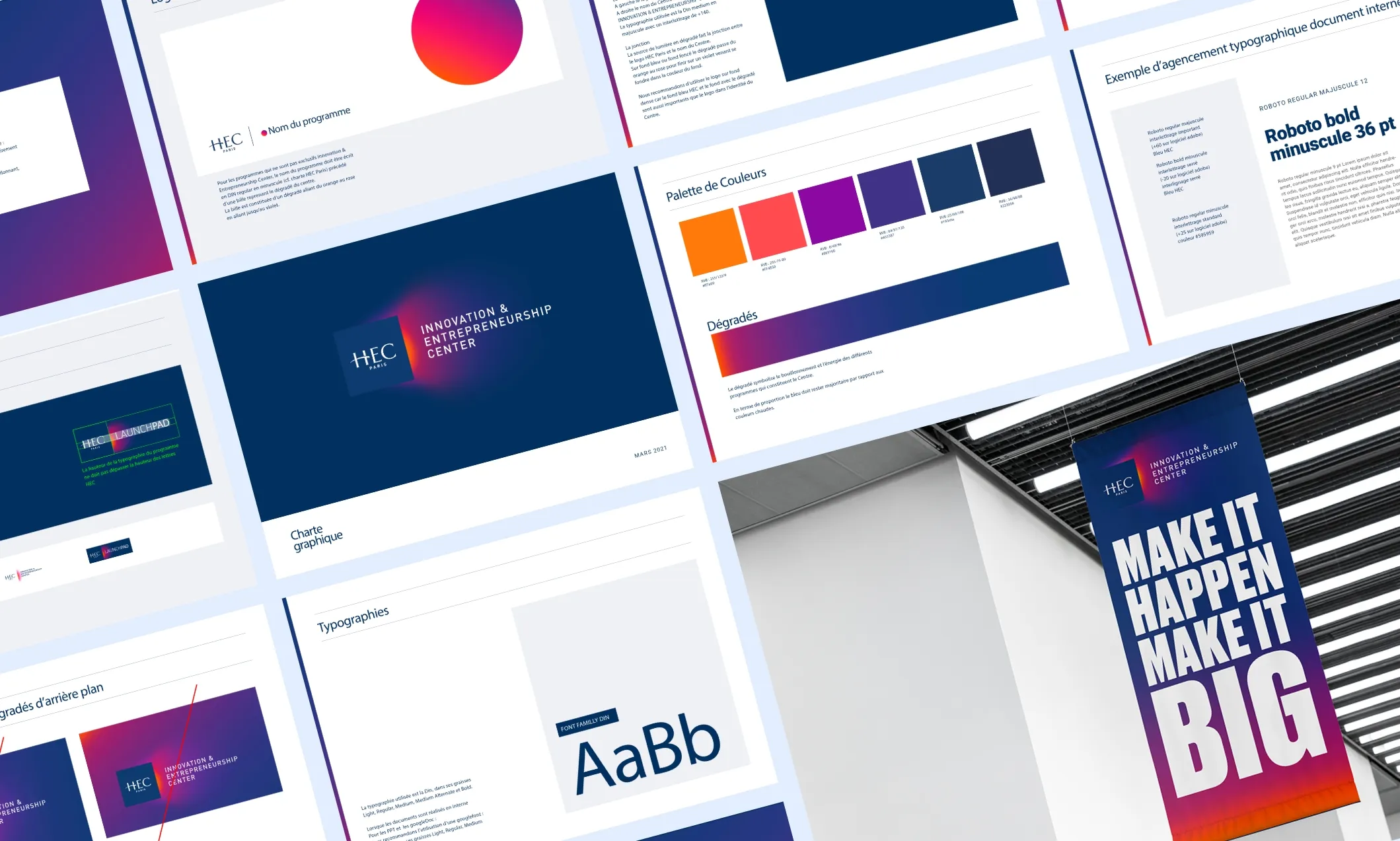 Impliquer les équipes internes au travers d’un travail collaboratif sous forme d’ateliers afin de fédérer et d’établir une plateforme de marque commune à tous les programmes liés à l’innovation. Puis travailler l’univers graphique. Le défi majeur était de réussir à rester dans le cadre de la charte très institutionnelle d’HEC Paris et de la compléter de codes tech et innovants. Notre parti-pris : valoriser le bleu HEC en venant le compléter d’un halo de lumière puissant et chaleureux afin de représenter le bouillonnement créatif et l’énergie du Centre d’Innovation.